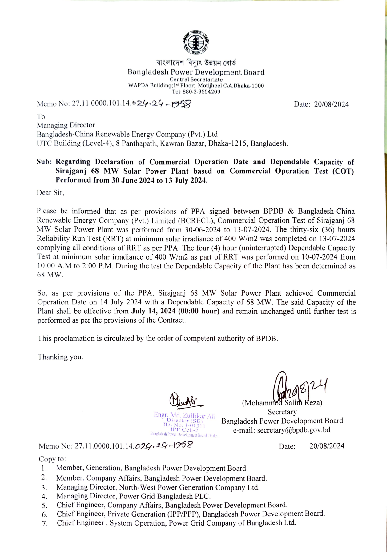 Renewable Energy Company (Pvt.) Limited (BCRECL), a platform for investment, construction, and operation jointly invested by Genertec CMC (a business unit of Genertec International) and North-West Power Generation Company Ltd., Bangladesh. BCRECL holds a total installed capacity quota of 500 MW of renewable energy approved by the Government of Bangladesh and is, so far, the largest renewable energy investment and construction project company with investment from a Chinese enterprise in Bangladesh.