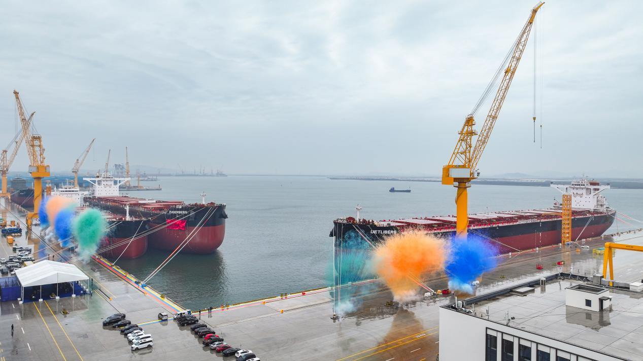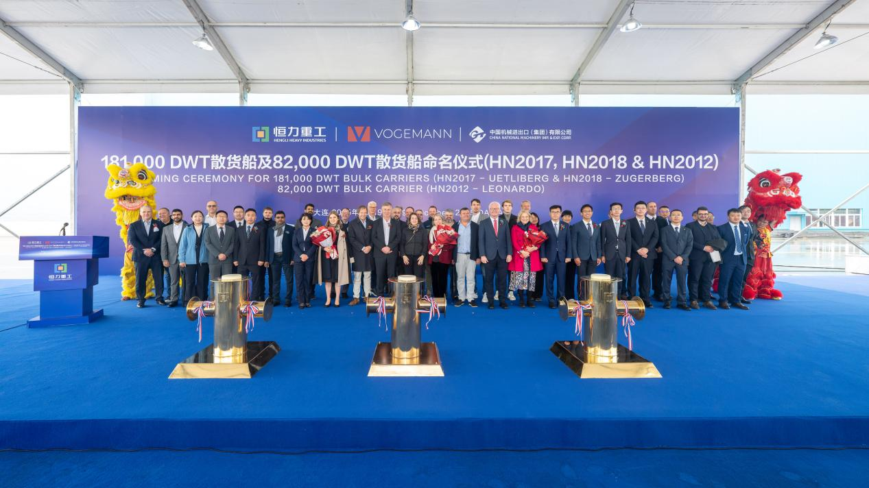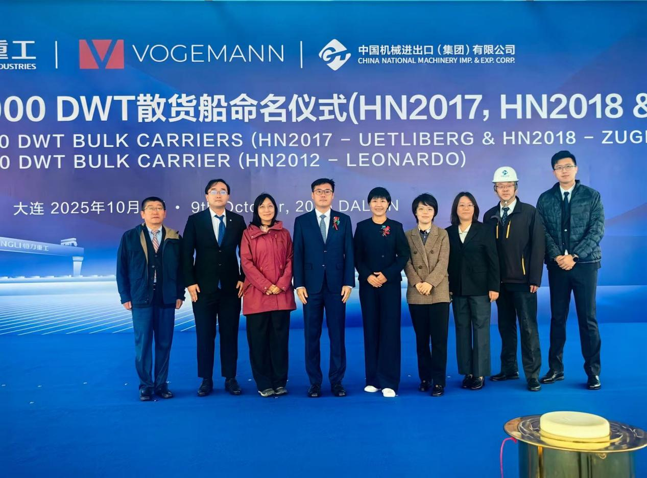 On October 9, the delivery ceremony for the first vessel and the naming ceremony for Vessel No. 2 under the 181,000 DWT bulk carrier export project to Germany, a collaboration between GENERTEC CMC and Hengli Shipbuilding (Dalian) Co., Ltd., were held in Dalian. Representatives from the Risk Control and Legal Department and Finance Department of GENERTEC International attended the event, with the General Manager of CMC delivering remarks on behalf of the company.