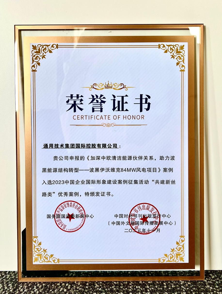 11月27日,在中央宣传部、国务院国资委、全国工商联指导,中国外文局主办的第十一届中国企业全球形象高峰论坛上,通用技术国际公司作品《加深中欧清洁能源伙伴关系,助力波黑能源结构转型——波黑伊沃维克84MW风电项目》获得了“2023年中国企业国际形象建设案例征集活动”“共建新丝路类”优秀案例奖项,并被收录到《中国企业国际形象建设案例集(2023)》。
